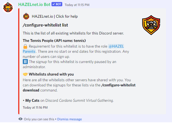 In addition to your own whitelists, it will also show whitelists that other servers have shared with you, and which server they belong to. No additional information about shared whitelists will be available, but the signups can be downloaded via /configure-whitelist download.