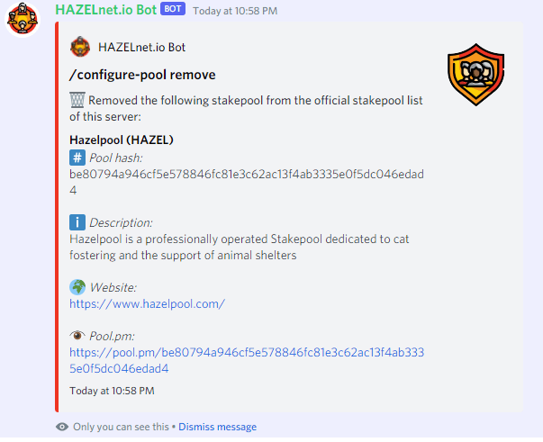 If you no longer want a specific stakepool listed in your Discord, you can use /configure-stakepool remove to remove it. You only need to provide the pool ID.
